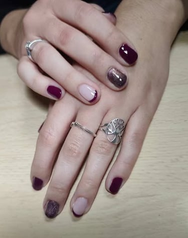 Estilo francés invertido, algunas uñas tienen una base rosa claro con punta burdeos, una variación moderna del clásico francés, colores combinados en tonos burdeos, rosa claro y un esmalte con glitter oscuro, creando contraste y sofisticación.