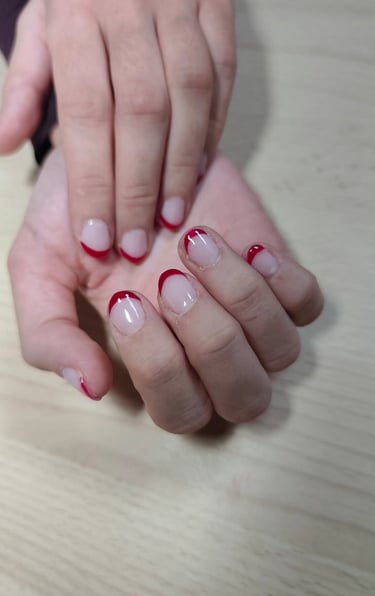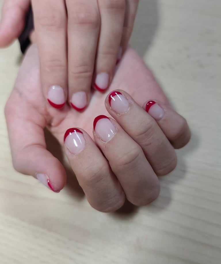 Manicura francesa en rojo base transparente o nude, un aspecto limpio y elegante, dejando que el color del borde destaque, un rojo vibrante, lo que aporta un toque moderno y atrevido, uñas limadas en forma natural o ligeramente almendrada, lo que complementa bien el diseño.