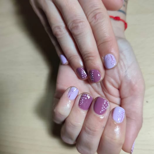 Colores alternados entre lavanda y malva, muy típicos del estilo pastel nails. Diseños de puntos blancos hechos con herramienta dotting tool. Los puntos varían en tamaño y disposición, lo que le da un toque artesanal y delicado. Acabado limpio y brillante, propio de una manicura semipermanente o gel.